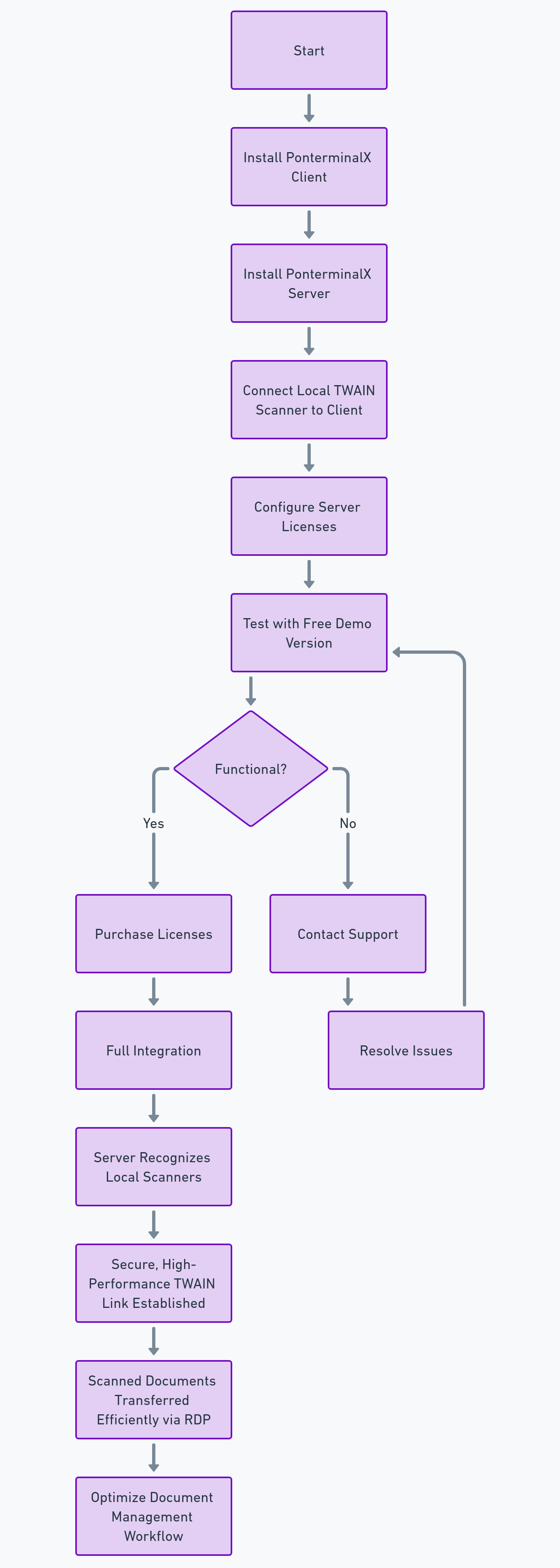 Licensing: The server component requires licenses based on the maximum number of connections. Free Demo Version: Test PonterminalX risk-free with a demo version that has no functional limitations but adds a watermark to transferred images. Broad Compatibility: Supports Microsoft Server versions 2011, 2016, 2019, and 2022 on the server side, and Windows 7, 8.x, 10, and 11 on the client side. Comprehensive Support: Each license comes with one year of free maintenance, support, and updates. Download Your Free Demo Today! Optimize your document management workflow by integrating PonterminalX into your system. Download the free demo version now and experience the seamless connectivity of local TWAIN scanners with your Windows Server applications.